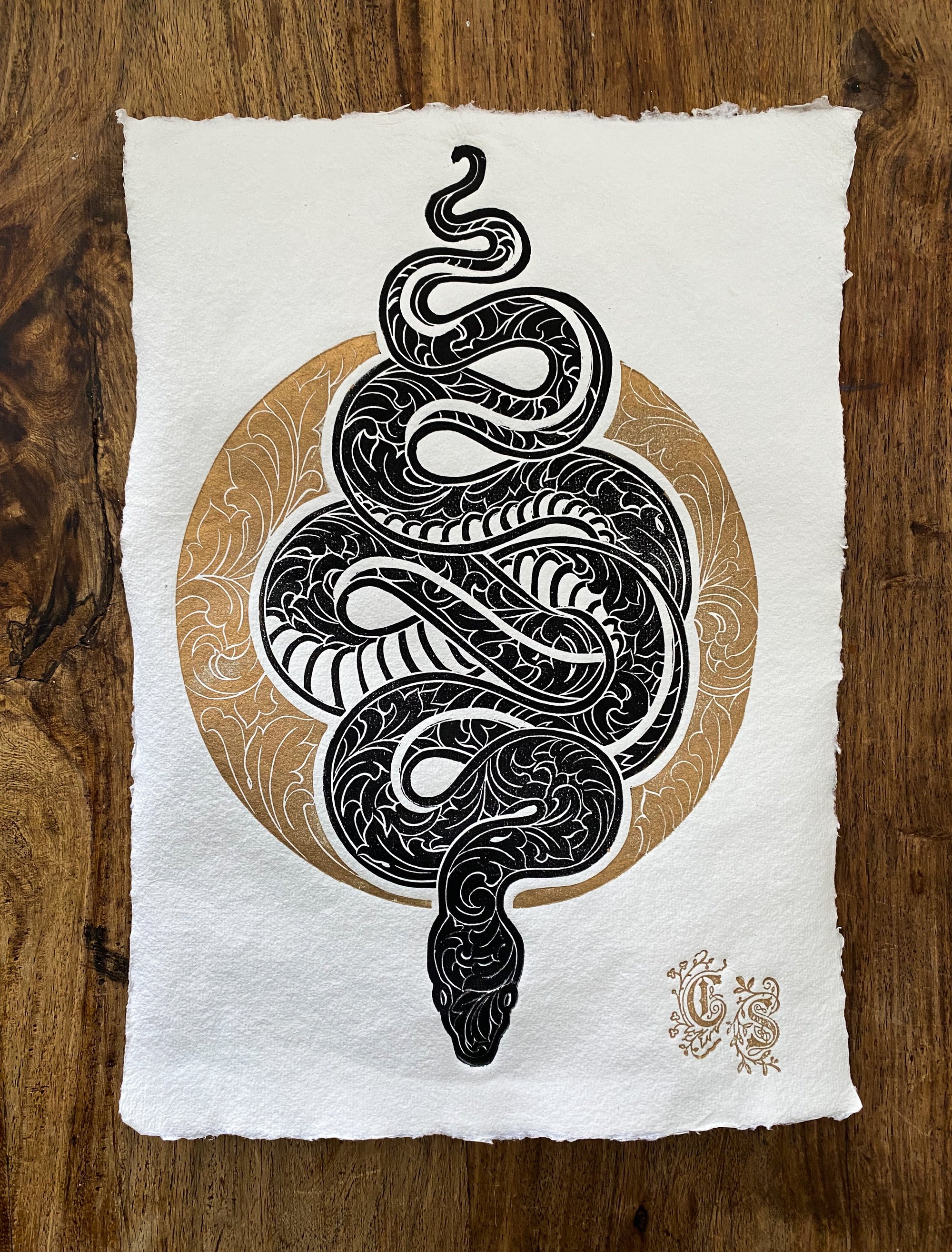 These prints are made from a linoleum block I designed at my home studio without solvents or harsh chemicals. Printed with black and gold linseed oil ink.