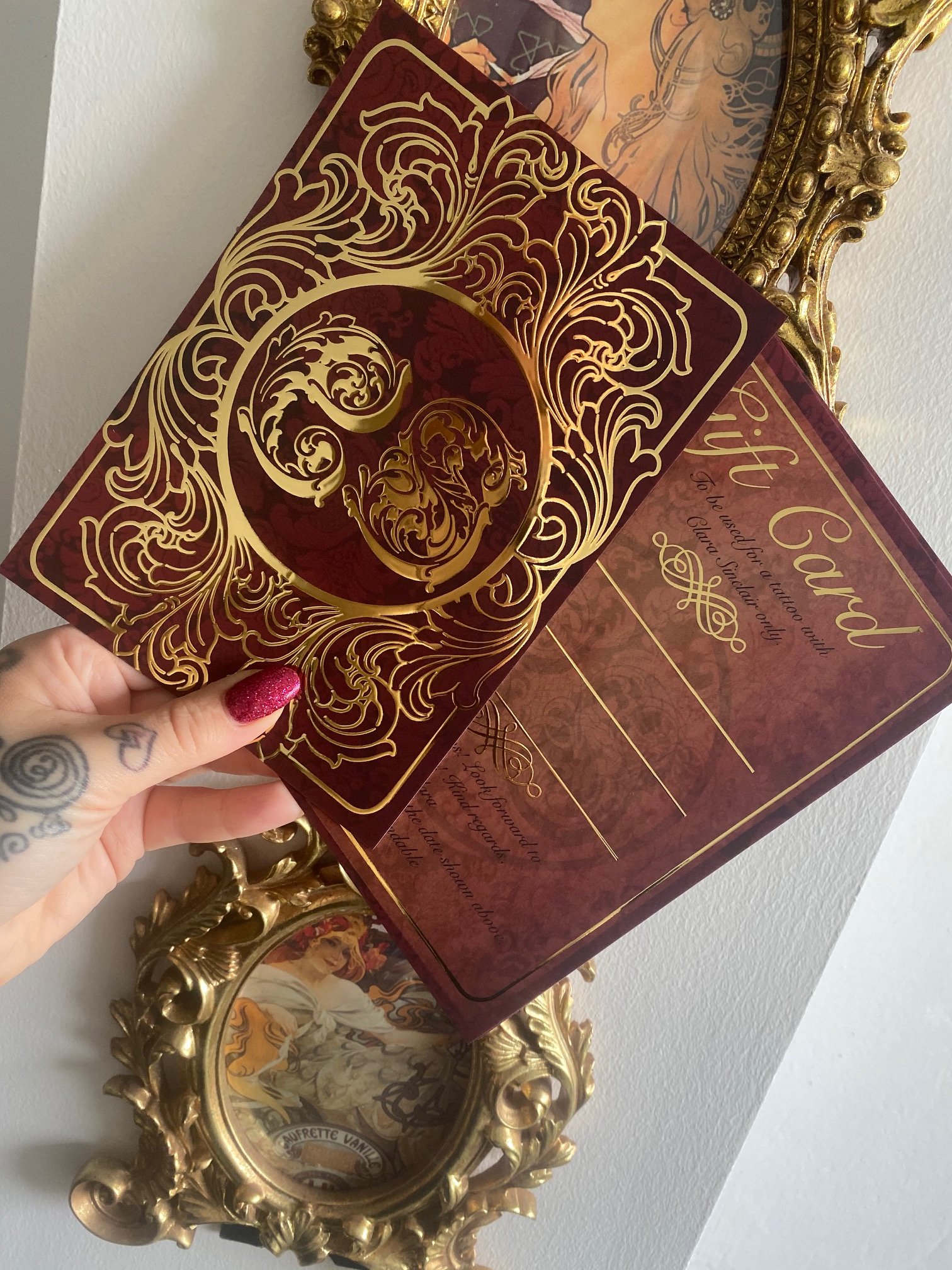 Gift cards Decorated with a burgundy demask background and gold foil detailing. Comes in a black envelope.